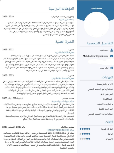 مهندس ميكانيك خريج جامعة تركية ابحث عن فرصة عمل